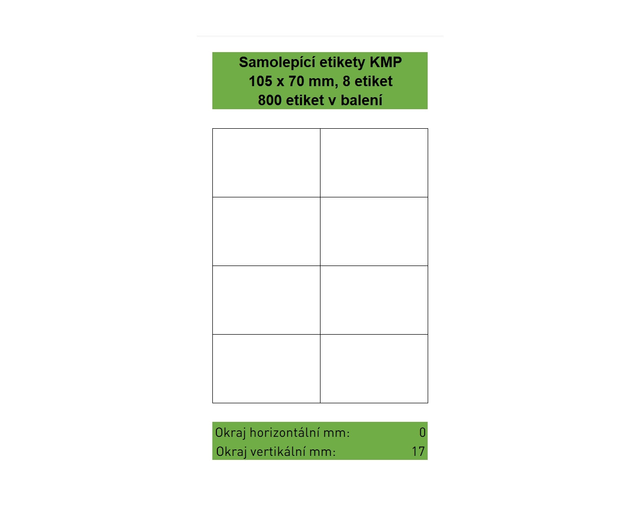Samolepící etikety KMP velikosti 105 x 70 mm, 8 etiket na listu, 100 listů A4 v balení, 800 etiket. Svrchní bílý bezdřevý matný papír klasické gramáže 70g/m². Spodní strana permanentní akrylátové lepidlo. Etikety jsou na podkladovém papíru o gramáži 55 g/m². Etikety jsou určeny pro potisk ve všech běžných typech laserových a inkoustových tiskáren. |