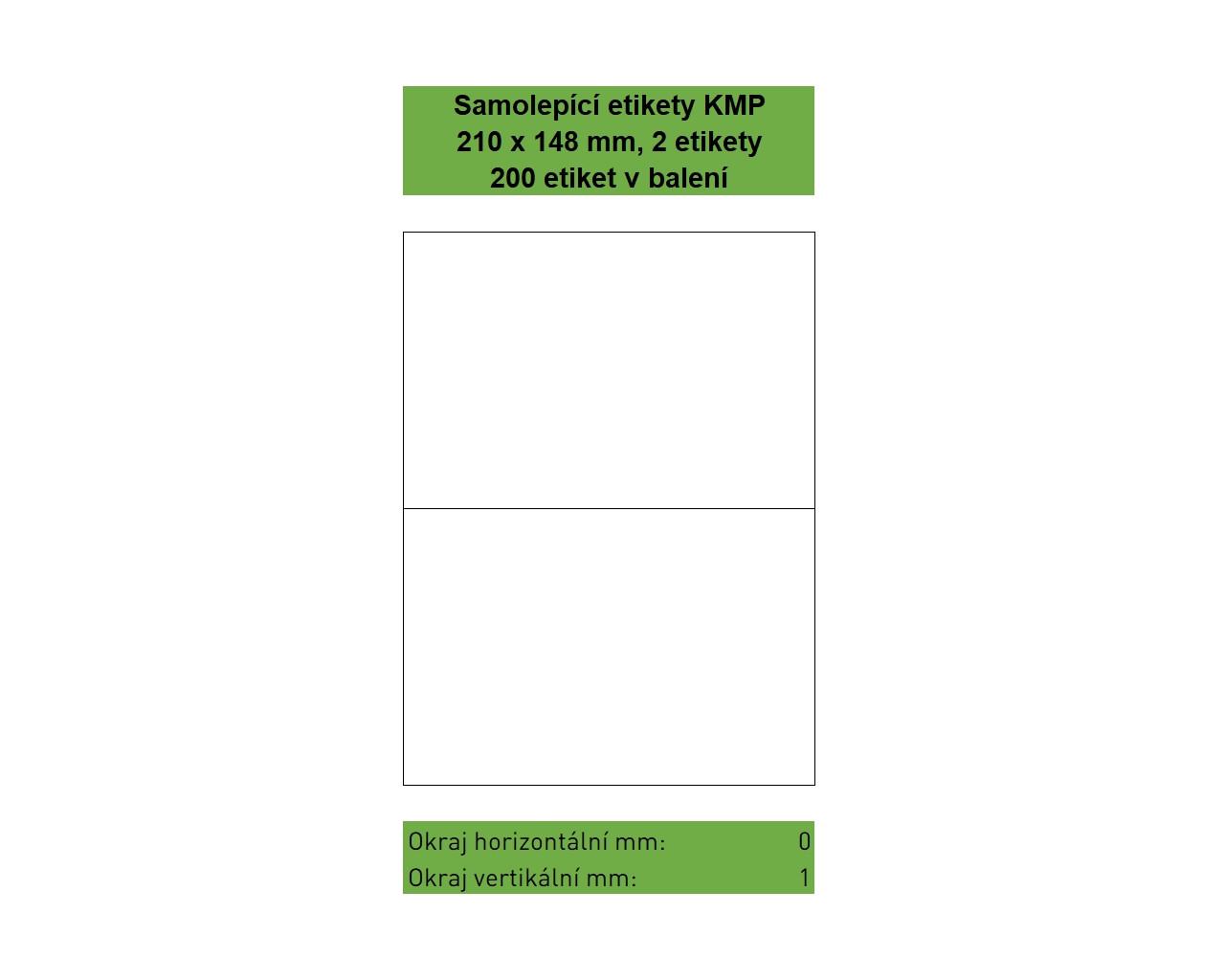 Samolepící etikety KMP velikosti 210 x 148 mm, 2 etikety na listu, 100 listů A4 v balení, 200 etiket. Svrchní bílý bezdřevý matný papír klasické gramáže 70g/m². Spodní strana permanentní akrylátové lepidlo. Etikety jsou na podkladovém papíru o gramáži 55 g/m². Etikety jsou určeny pro potisk ve všech běžných typech laserových a inkoustových tiskáren. |