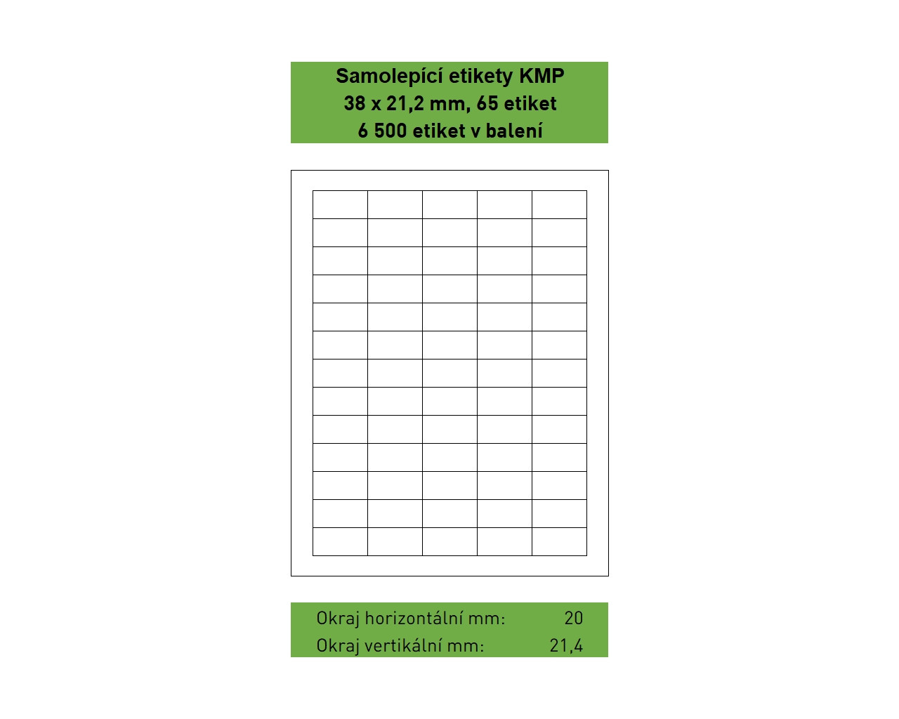 Samolepící etikety KMP velikosti 38 x 21,2 mm, 65 etiket na listu, 100 listů A4 v balení, 6 500 etiket. Svrchní bílý bezdřevý matný papír klasické gramáže 70g/m². Spodní strana permanentní akrylátové lepidlo. Etikety jsou na podkladovém papíru o gramáži 55 g/m². Etikety jsou určeny pro potisk ve všech běžných typech laserových a inkoustových tiskáren. |
