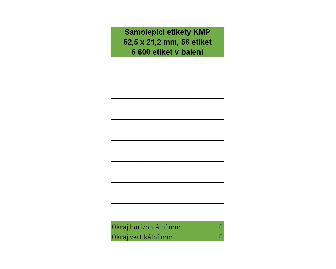 Samolepící etikety KMP velikosti 52,5 x 21,2 mm, 56 etiket na listu, 100 listů A4 v balení, 5 600 etiket. Svrchní bílý bezdřevý matný papír klasické gramáže 70g/m². Spodní strana permanentní akrylátové lepidlo. Etikety jsou na podkladovém papíru o gramáži 55 g/m². Etikety jsou určeny pro potisk ve všech běžných typech laserových a inkoustových tiskáren. Rozřez kompletní A4 – pro tiskárny s funkcní bezokrajového tisku. |