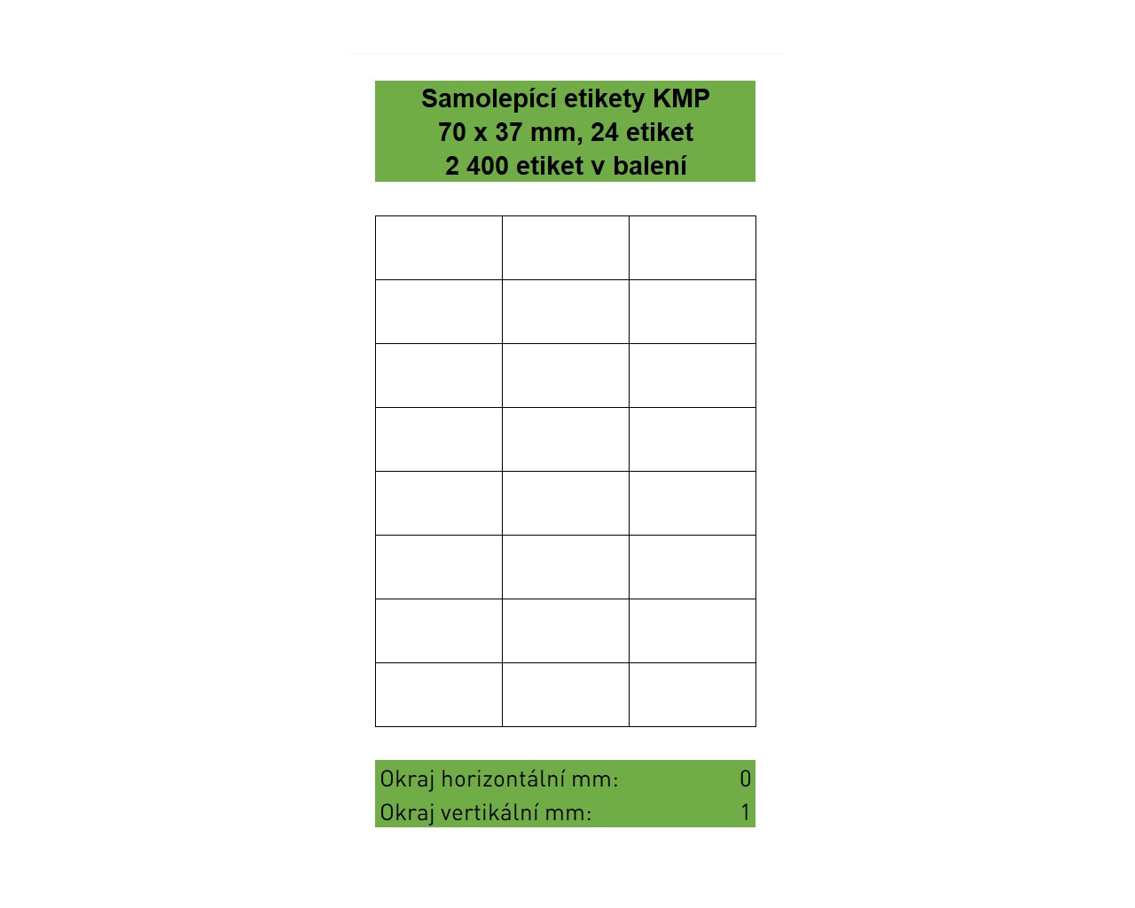 Samolepící etikety KMP velikosti 70 x 37 mm, 24 etiket na listu, 100 listů A4 v balení, 2 400 etiket. Svrchní bílý bezdřevý matný papír klasické gramáže 70g/m². Spodní strana permanentní akrylátové lepidlo. Etikety jsou na podkladovém papíru o gramáži 55 g/m². Etikety jsou určeny pro potisk ve všech běžných typech laserových a inkoustových tiskáren. |
