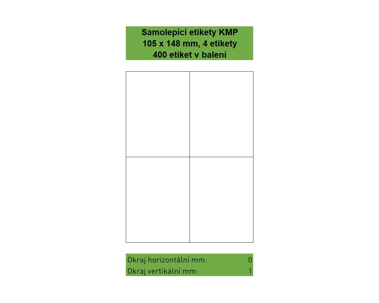 Samolepící etikety KMP velikosti 105 x 148 mm, 4 etikety na listu, 100 listů A4 v balení, 400 etiket. Svrchní bílý bezdřevý matný papír klasické gramáže 70g/m². Spodní strana permanentní akrylátové lepidlo. Etikety jsou na podkladovém papíru o gramáži 55 g/m². Etikety jsou určeny pro potisk ve všech běžných typech laserových a inkoustových tiskáren. |