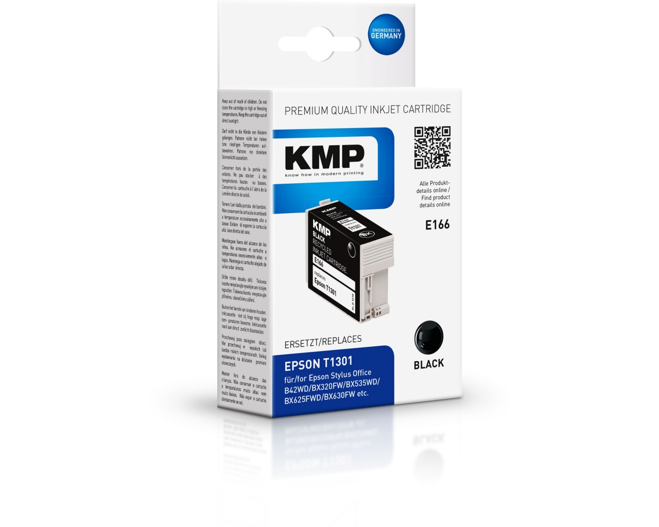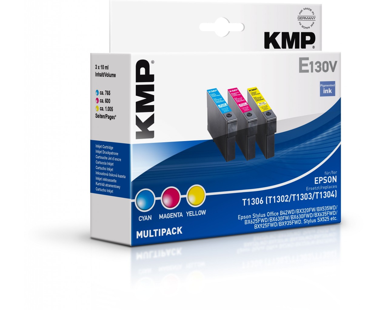 Náplně byly testovány v časopise Stiftung Warentest (www.test.de - vydání 10/2012). Výsledné hodnocení náplně KMP: dobrý (2,2) - žádný z konkurentů se tolik nepřiblížil originálu jako cartridge KMP. V odolnosti proti setření, odolnosti proti vodě a odolnosti prosti světlu si cartridge KMP vedly velmi dobře a velmi dobře byla hodnocena tisková kvalita textu, grafiky i fotografií. Testovány byly také časopisem Computer-Magazin c't (vydání 11/2012) - „Nejlepší kvalitu inkoustu dodává společnost KMP. Je rovnocenný originálu a přináší ještě trochu lepší barevné snímky než inkoust Epson". Kompatibiní s originální inkoustovou cartridgí Epson s jablkem na obalu. |