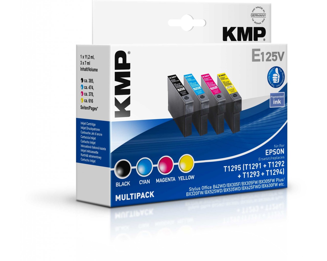 Náplně byly testovány v časopise Stiftung Warentest (www.test.de - vydání 10/2012). Výsledné hodnocení náplně KMP: dobrý (2,2) - žádný z konkurentů se tolik nepřiblížil originálu jako cartridge KMP. V odolnosti proti setření, odolnosti proti vodě a odolnosti prosti světlu si cartridge KMP vedly velmi dobře a velmi dobře byla hodnocena tisková kvalita textu, grafiky i fotografií. Testovány byly také časopisem Computer-Magazin c't (vydání 11/2012) - „Nejlepší kvalitu inkoustu dodává společnost KMP. Je rovnocenný originálu a přináší ještě trochu lepší barevné snímky než inkoust Epson". Kompatibiní s originální inkoustovou cartridgí Epson s jablkem na obalu. |